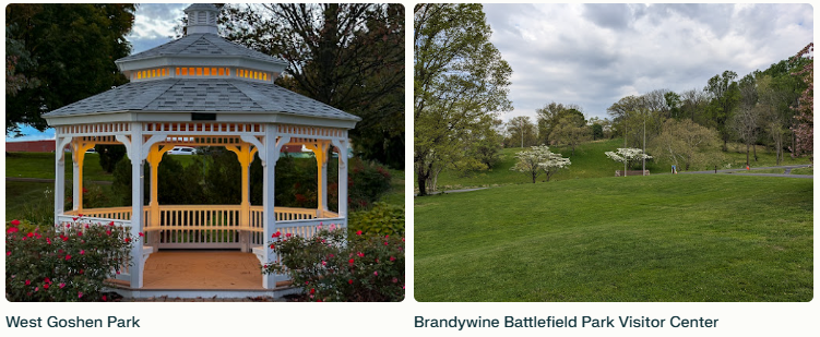 Spend your holiday afternoon amid towering oaks and manicured picnic areas at West Goshen Park, where baseball fields, tennis courts, and shaded tables invite families and friends to relax and play in equal measure. For a deeper dive into American history, head to the Brandywine Battlefield Park Visitor Center south of West Chester. This 18th-century Revolutionary War site pairs scenic trails and open lawns with interpretive exhibits that bring the region’s past vividly to life.